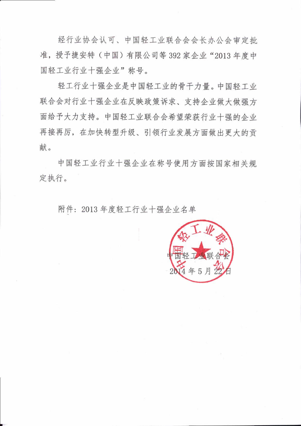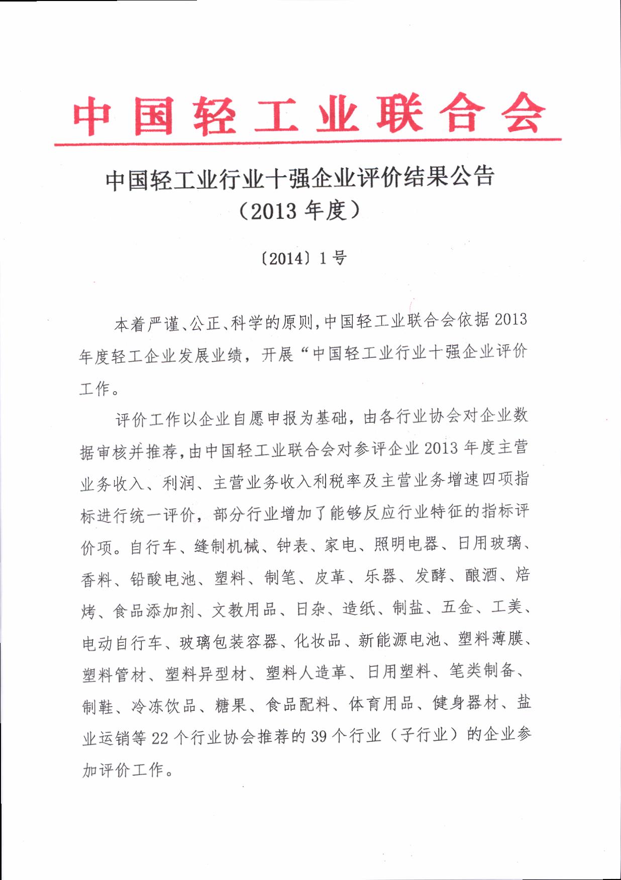 权威发布:2013年度中国轻工业行业十强企业评价结果公告