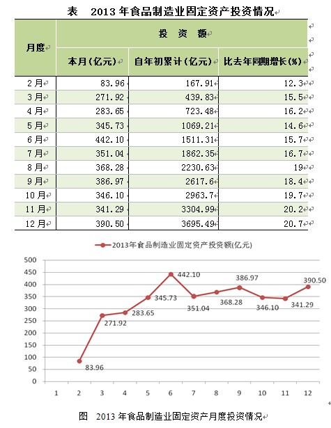 国家统计局数据显示:2013年1-12月,全国食品制造业规模以上企业固定资产投资额3695.49亿元,同比增长20.7%,增速超过全国平均水平1.1个百分点,超过同期制造业2.2个百分点,投资额占全国投资额比重的0.85%。占制造业投资额比重的2.51%。全年中,上半年固定资产投资环比快速增长,食品加工业相关行业吸纳资金较多。下半年投资额相对稳定,全年累计增速逐月加大。