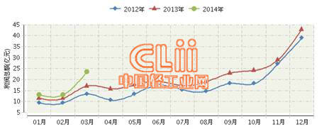 图1 2014年1~3月全国陶瓷行业连续三年月度利润总额对比