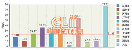 2014年1~3月,全国陶瓷行业累计完成利润总额居前三位的地区依次是江西、山东、河南。其中江西累计完成利润总额同比增长17.18%,占24.16%;山东累计同比增长9.83%,占18.29%;河南累计同比增长24.17%,占15.48%,详见图2。