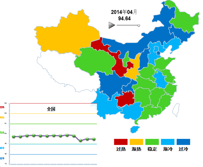 从分地区五金行业景气指数看,与2014年3月份相比:处于“过热”区域的地区有所减少,仅剩甘肃和贵州两地区;甘肃和新疆两个地区由3月份所处的“过热”区域变为了“渐热”区域;吉林、内蒙、山西、重庆继续处于“过冷”去,3月份处于“稳定”区的天津和处于“渐冷”区的四川两地区,本月也加入了“过冷”区,此区域明显分布在我国中西部地区;辽宁、河北、安徽、云南、北京、广西六地区处于“渐冷”区,涉及到的地区较3月略有减少;此外,其它大部分地区均处于“稳定”区,此区域主要集中在我国东部地区。