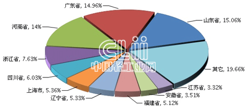 1~5月,家具行业累计利润额居全国前十的地区依次是山东、广东、河南、浙江、四川、上海、辽宁、福建、安徽及江苏,与1~4月相比,广东与河南的位次互换,上海上升两位,湖南跌出前十,江苏成为第十位。其中,山东的累计利润总额(下同)占15.06%,广东占14.96%,河南占14.00%,浙江占7.63%,四川占6.03%,上海占5.36%,辽宁占5.33%,福建占5.12%,安徽占3.51%,江苏占3.32%(图6)。