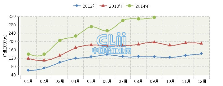 2014年全国白炽灯泡行业连续三年月度产量对比