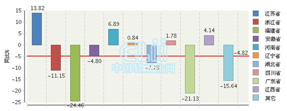 2015年1~2月全国荧光灯行业累计产量主要地区同比增长情况