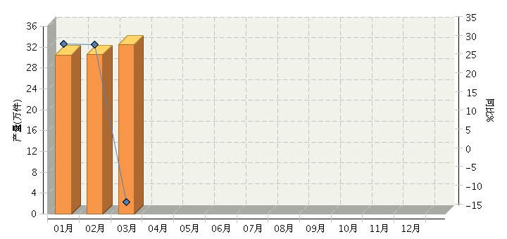 根据国家统计局公布数据2015年1~3月,全国天然毛皮服装行业累计完成产量93.29万件,同比增长11.51%。其中:3月份完成产量32.43万件,同比增长-11.9%。2015年月度数据走势及同比增长情况如下图所示。