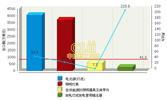 2015年1~6月,全国照明行业对阿根廷完成累计出口额8,578.00万美元,同比增长41.29%。其中,电光源(灯泡)完成累计出口额4039.94万美元(占47.1%),同比增长52.5%;照明灯具完成累计出口额3701.19万美元(占43.15%),同比增长31.63%;自供能源的照明器具及其零件完成累计出口额561.36万美元(占6.54%),同比增长7.33%;放电灯或放电管用镇流器完成累计出口额275.51万美元(占3.21%),同比增长215.84%。
