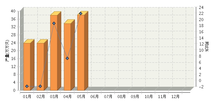 根据国家统计局公布数据,2016年1~5月,全国原电池及原电池组(折R20标准只)行业累计完成产量同比增长11.48%。其中:5月份完成产量同比增长23.24%。2016年全国原电池及原电池组行业月度产量及同比如下图所示。