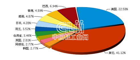 2017年1~9月,全国高强度气体放电灯(HID灯)行业完成累计出口额1.83亿美元,同比增长-13.73%。出口额排在前五位的国家依次是美国、巴西、香港、越南、日本。其中:美国完成累计出口额0.41亿美元(占22.58%)。