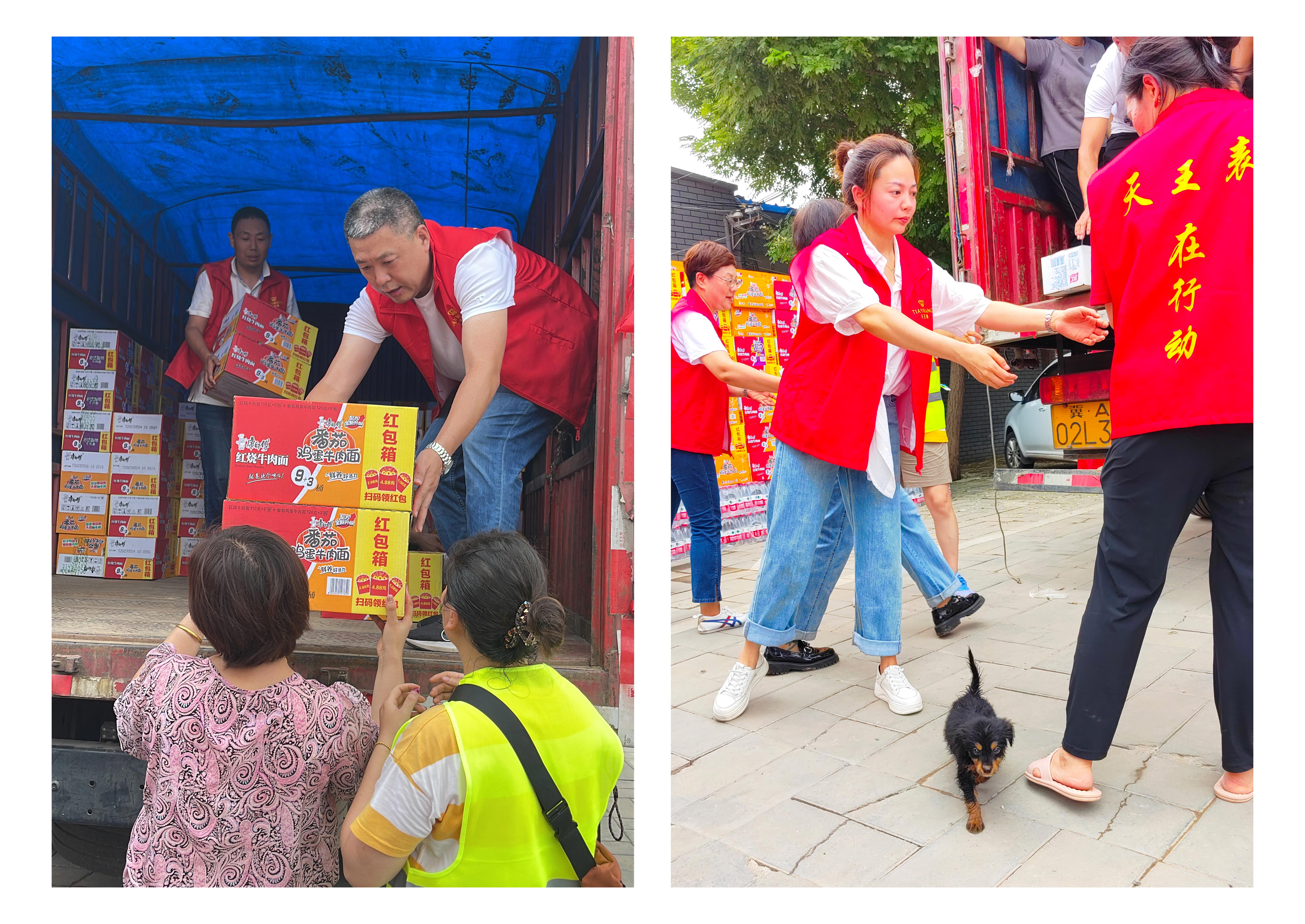 涿州刁四村洪水未退,当地各部门正在积极开展救灾工作,天王表河北团队表示“虽然不能奋战在抗汛一线,但希望能为防汛工作尽一些绵薄之力”。天王表河北团队主动联系到受灾严重地区涿州市刁窝镇刁四村的村委会,了解到救灾情况及物资需求,在不影响当地救灾的大前提条件下,于8月4日上午将800箱方便面、800箱矿泉水、100箱火腿肠,共计10万余元的救灾应急物资,经协调沟通后,停在离高速不远的空地,将应急物资有序分发给当地居民。