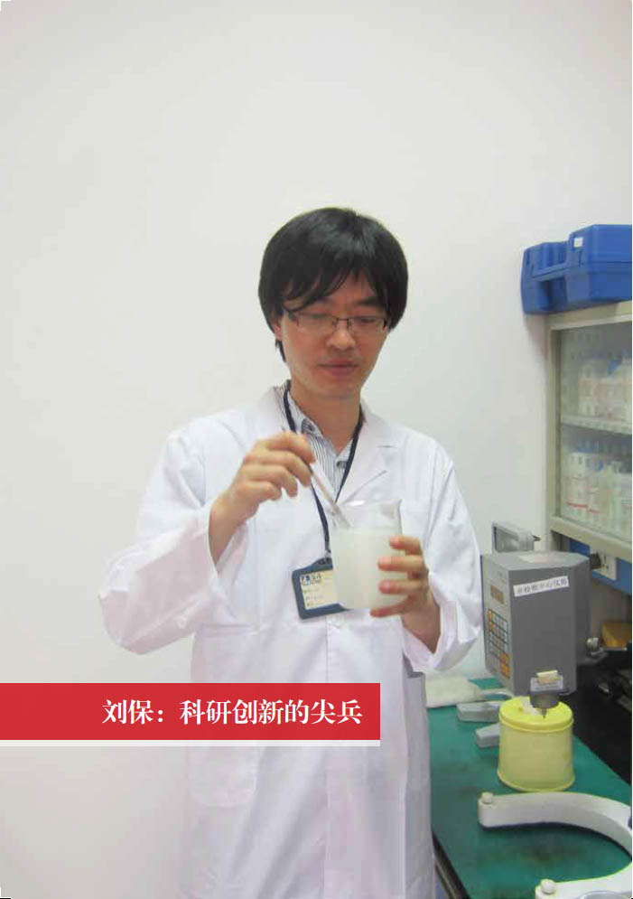 为了追求产品的高质量,刘保多次对产品进行仪器检测,甚至还用自己的身体来做试验。在研制婴儿沐浴液时,虽然用专门的仪器检测起泡度也能够通过检测数据推断产品的酸碱度与人体是否相适配,但他仍坚持用自己的手接触试验中的沐浴液获得感官数据,以更好地了解新产品的性能。反复冲洗手部会把皮肤表层的油脂都洗掉,令皮肤干燥甚至出现龟裂现象,然而刘保总是在默默涂抹护手霜作为保护后又开始新一轮的检测。刘保留着中长发,因此常招来异样目光,殊不知他是在用自己的头发来做试验,检测洗发水的柔顺度、光泽度、干梳情况和湿梳情况等。刘保认为,公司以销售洗涤产品为主,这些产品会直接接触使用者的皮046 肤、头发等。亲身检测的结果尽管不太准确,但如果自己都不能接受,就无法推己及人。