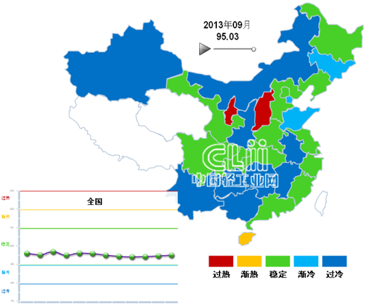 发布2013年9月中轻家具景气指数。9月,中轻家具景气指数95.03,其中:主营业务收入景气指数为93.70,出口景气指数为98.65,资产景气指数为103.49,利润景气指数为90.89(图1)。