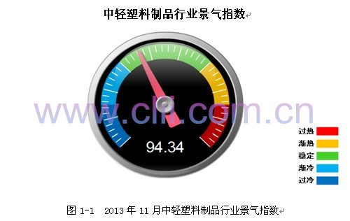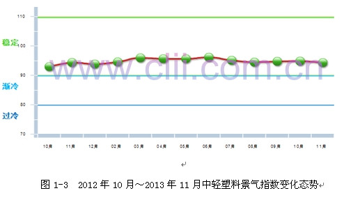 2013年11月份中轻塑料景气指数为94.34,比10月小幅回落0.55,今年前11个月指数在绿色稳定区间内呈震荡走势。