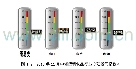 去年塑料指数运行在稳定区间下轨,显示行业总体经济运行增速有所放缓。2013年前6个月塑料制品景气指数仍在低位运行,但逐步企稳回升,6月指数值为上半年最高值,比去年12月份提高2.32。11月指数继续小幅回落,走势符合行业运行规律,预计全年指数呈震荡上行走势。