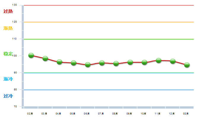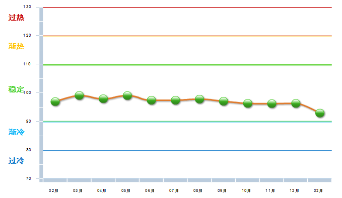2013年12月至2014年2月中轻工艺美术景气指数处于基本稳定状态。与2013年2月同期比较略有下降,2014年2月份中轻工艺美术景气指数与2013年12月份相比下降近2点。(参见图2