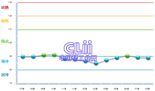 2014年8月,家具行业利润景气指数在“渐冷”区间延续了7月下跌的走势,环比7月下降了0.34个百分点(图1)。