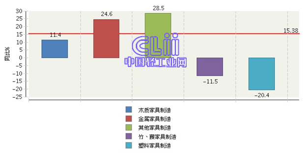 同期,金属家具制造业和其他家具制造业的累计利润总额增速(下称“累计增速”)均超过了20%,分别比家具行业平均水平高了9.19个百分点和13.10个百分点;木制家具制造业的累计增速低于行业平均线,为11.43%;塑料家具制造业、竹、藤家具制造业依旧为两位数负增长,分别为-20.39%和-11.47%(图5)。