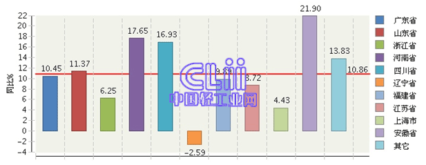 图7 2014年主要地区家具行业规模以上企业累计主营业务收入增速情况