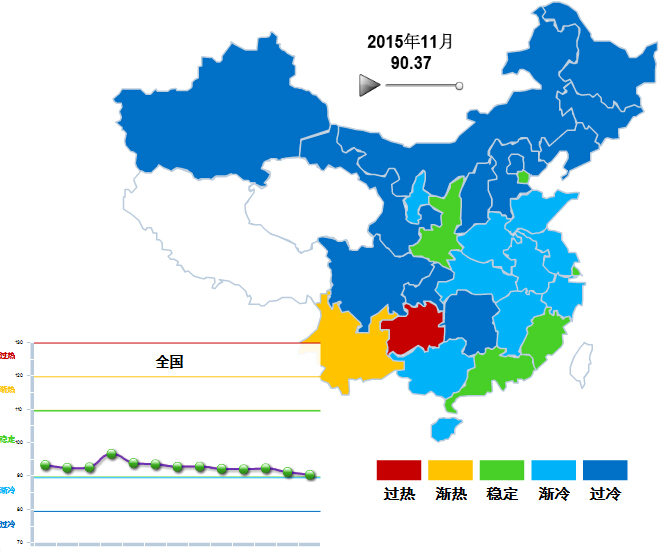 11月,只有贵州一个地区处于“过热”区域,云南一地区处于 “渐热”区域。处于“稳定”区域的地区数目有所增加,由上月的三个地区增加为陕西、天津、上海、福建和广东五个地区。