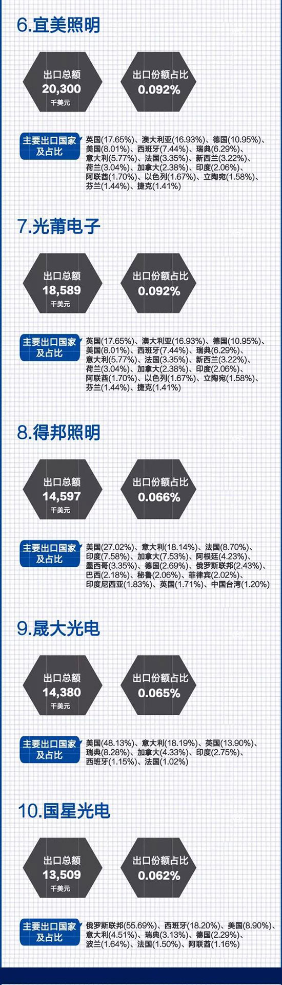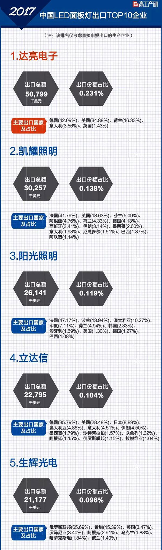 其中,排在前十企业合计出口2.33亿美元,占面板灯总出口额的13%。2017年中国LED面板灯出口TOP10企业如下:(注:该排名仅考虑直接申报出口的生产企业)