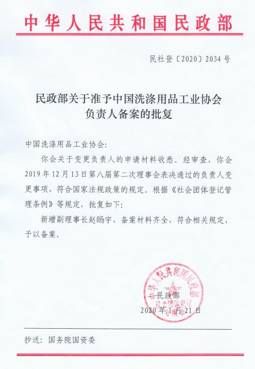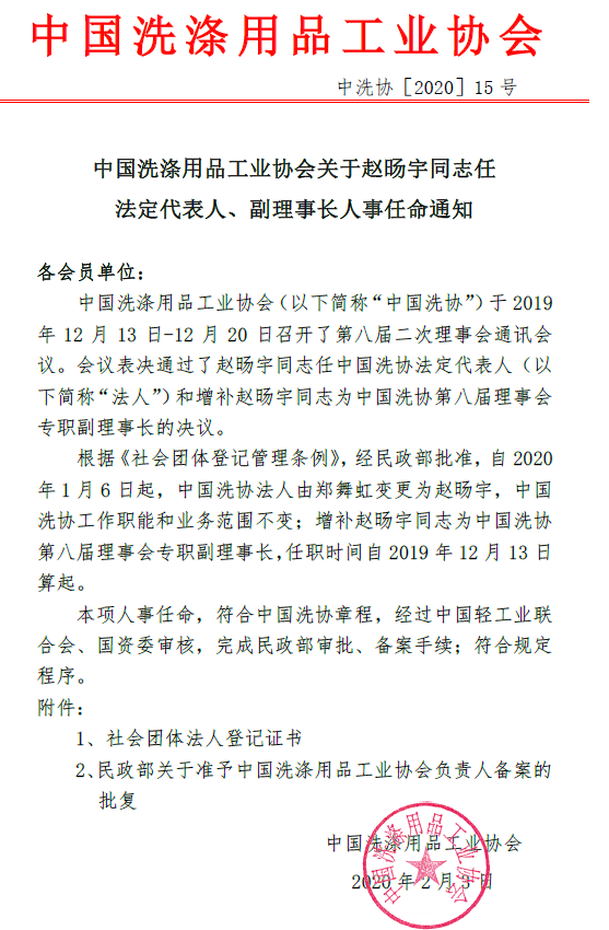 中国洗涤用品工业协会关于赵旸宇同志任法定代表人、副理事长人事任命通知