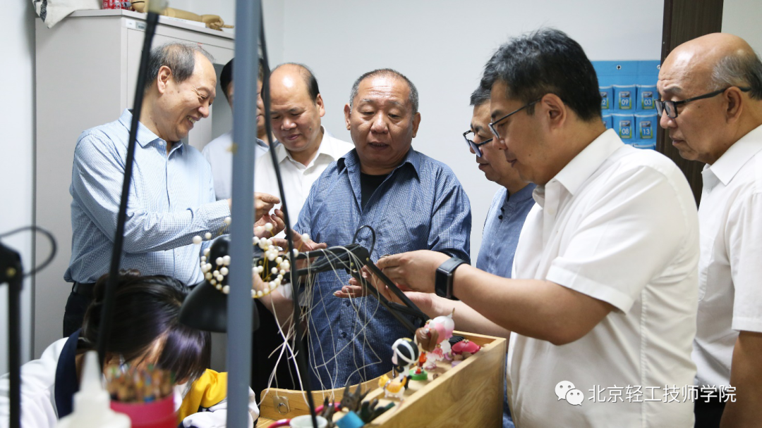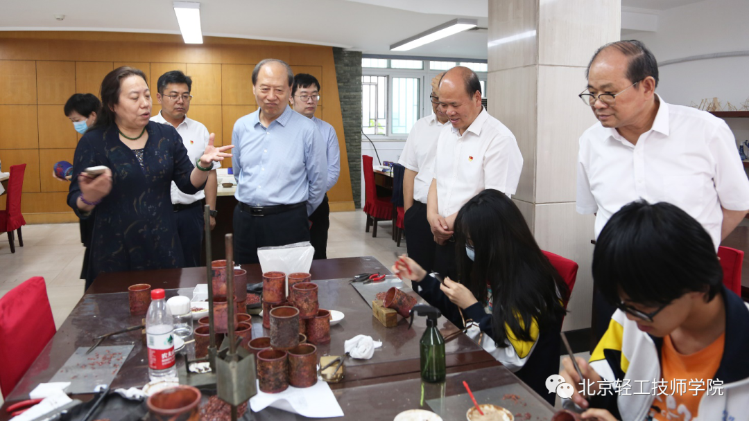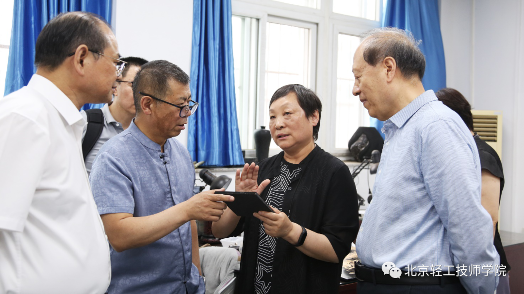 接下来,王世成书记一行前往学院天桥教学区参观调研,参观了苏然大师工作室(玉雕)、李春柯大师工作室(牙雕)、崔奇铭大师工作室(玉雕)、万紫大师工作室(金漆镶嵌)、于鸿雁大师工作室(烫蜡)、郑道全大师工作室(玉雕),走进花丝镶嵌实训室、景泰蓝实训室、雕漆实训室、京绣实训室、宫毯实训室、木雕实训室、内画实训室等实训教学基地,并参观了工艺美术作品展览室。