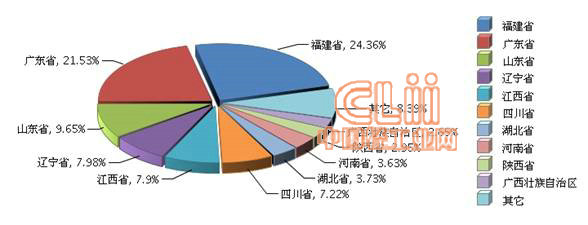 图2 2013年1~9月全国陶瓷砖累计产量地区占比情况