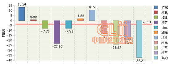 图5 2013年1~9月全国陶瓷行业累计出口额主要地区同比增长情况