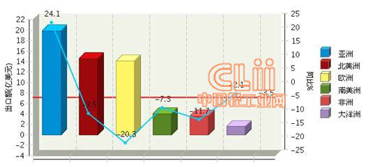 图9 2013年1~9月全国陶瓷行业累计出口额各大洲同比情况
