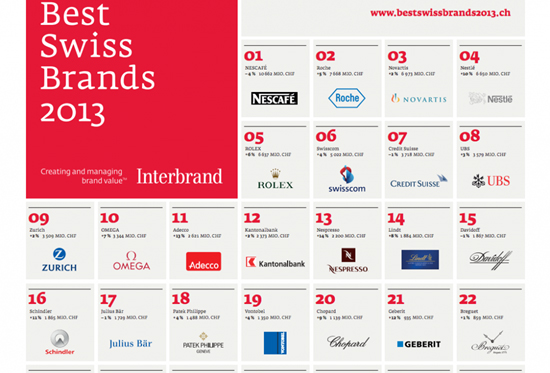 根据Interbrand 公布的“2013年最佳瑞士品牌”,前50大瑞士品牌中的16个都是钟表品牌。