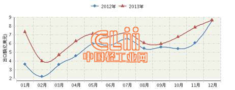 2013年全国陶瓷瓷砖行业连续二年月度出口额对比