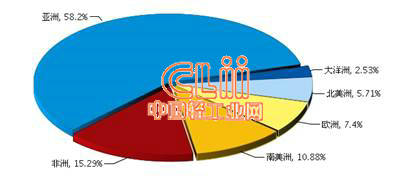 2013年1~12月全国陶瓷砖累计出口额各大洲占比情况