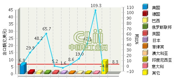 从出口贸易国看,2013年,福建照明行业累计出口额排在前三位的国家依次是美国、德国和巴西。其中:美国完成累计出口额6.24亿美元(占28.34%),同比增长6.8%;德国完成累计出口额1.36亿美元(占6.16%),同比增长29.92%;巴西完成累计出口额1亿美元(占4.52%),同比增长48.25%。