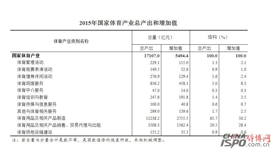 经核算,2015年,国家体育产业总产出(总规模)为1.7万亿元,增加值为5494亿元,占同期国内生产总值的比重为0.8%。从国家体育产业11个大类看,体育用品和相关产品制造业总产出和增加值最大,分别为11238.2亿元和2755.5亿元,占国家体育产业总产出和增加值的比重分别为65.7%和50.2%;体育服务业(除体育用品和相关产品制造业、体育场地设施建设外的其他9大类)总产出和增加值分别为5713.6亿元和2703.6亿元,占比分别为33.4%和49.2%。
