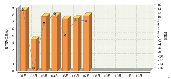 根据海关总署发布数据,2014年1~7月,全国食品行业累计完成出口额51.62亿美元,同比增长6.95%。上半年中,除2月份出口额较低外,其他月份出口额变化不大。与2013年同期相比,1月出口增长最快,达15.14%;2月份出口同比下降14.6%,其他月份出口增长较平稳。月度出口额及同比增长趋势如下图所示。