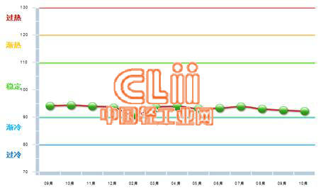 2014年10月中轻陶瓷景气指数92.17,处于稳定区间,较上月回落0.36,参见图1-1。