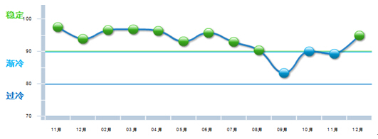 2014年下半年食品行业出口景气指数一路下滑,至9月份进入渐冷区间,12月份回升到绿色稳定区间。