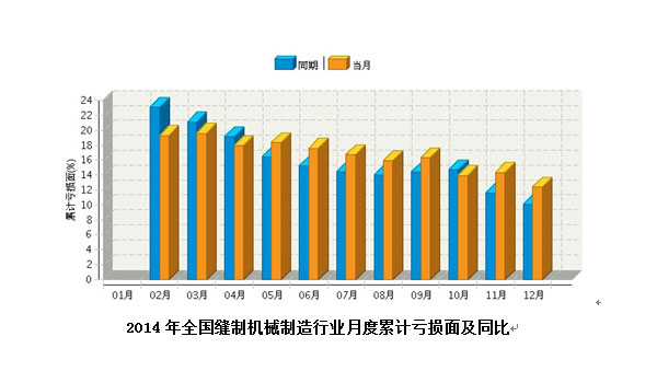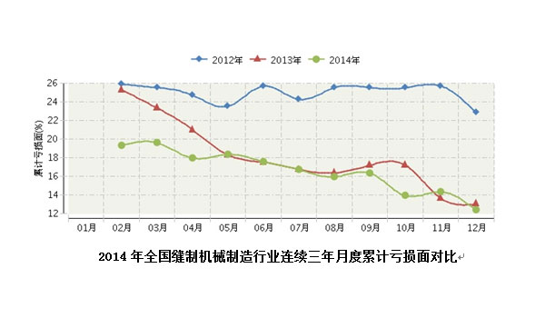2014年1~12月,全国缝制机械制造行业累计亏损面为12.40%,同比增长2.33%。其中:1月~2月份累计亏损面为19.32%,同比增长-3.79%;1月~3月份累计亏损面为19.62%,同比增长-1.51%;1月~4月份累计亏损面为17.97%,同比增长-1.17%;1月~5月份累计亏损面为18.36%,同比增长1.95%;1月~6月份累计亏损面为17.58%,同比增长2.34%;1月~7月份累计亏损面为16.73%,同比增长2.33%;1月~8月份累计亏损面为15.95%,同比增长1.95%;1月~9月份累计亏损面为16.34%,同比增长1.95%;1月~10月份累计亏损面为13.95%,同比增长-0.78%;1月~11月份累计亏损面为14.34%,同比增长2.71%;1月~12月份累计亏损面为12.4%,同比增长2.33%。
