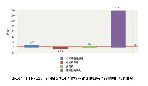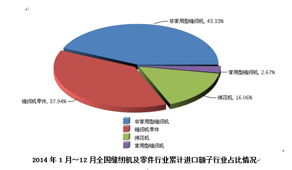2014年1~12月,全国缝纫机及零件行业完成累计进口额2.63亿美元,同比增长4.01%。其中,非家用型缝纫机完成累计进口额1.14亿美元(占43.33%),同比增长9.49%;缝纫机零件完成累计进口额1亿美元(占37.94%),同比增长-5.39%;绣花机完成累计进口额0.42亿美元(占16.06%),同比增长4.59%;家用型缝纫机完成累计进口额0.07亿美元(占2.67%),同比增长139.14%。