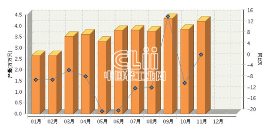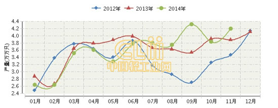 2014年1~11月,全国荧光灯累计产量39.27亿只,同比增长-7.87%。其中,11月份产量4.2亿只,同比增长1.59%。
