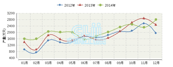2014年河北白炽灯泡行业连续三年月度产量对比
