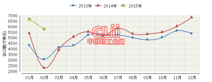 2015年全国白炽灯泡行业连续三年月度出口额对比