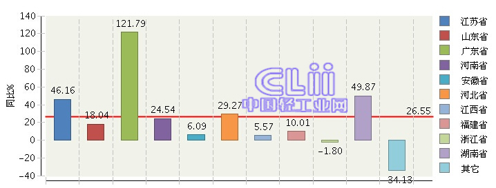 从上图可以看出,在全国玩具的十大主产区中,广东省一季度累计利润总额同比增速最快,其次是湖南省同比增长49.87%,江苏省同比增长46.16%,接下来依次是河北、河南、山东、福建、安徽、江西,唯一出现负增长的是浙江省。