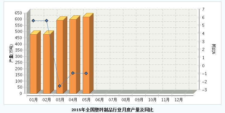 中国轻工业经济运行及预测预警系统监测显示:5月份塑料制品行业规模以上企业完成产量617.73万吨,同比增长-0.49%,增幅比4月份降低0.05个百分点,塑料制品月度产量已连续3个月负增长。1月~5月,塑料制品累计产量2766.09万吨,同比增长0.92%。