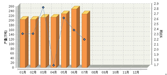 根据国家统计局公布数据,2015年1月~7月,全国乳制品行业累计完成产量1543.86万吨,同比增长2.12%。其中:其中:1月份完成产量204.71万吨,同比增长2.37%;2月份完成产量204.71万吨,同比增长2.37%;3月份完成产量213.33万吨,同比增长2.88%;4月份完成产量213.74万吨,同比增长1.74%;5月份完成产量228.53万吨,同比增长2.68%;6月份完成产量248.81万吨,同比增长2.44%;7月份完成产量228.03万吨,同比增长2.25%。