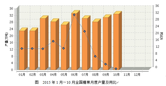 2015年1~10月我国糖果累计产量同比增长7.52%