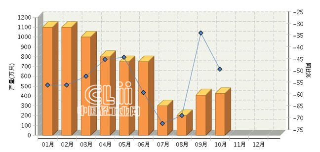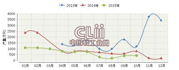 2015年1~10月,四川白炽灯泡累计产量6835.00万只,同比增长-42.30%。其中: 10月份完成产量425万只,同比增长-46.87%。