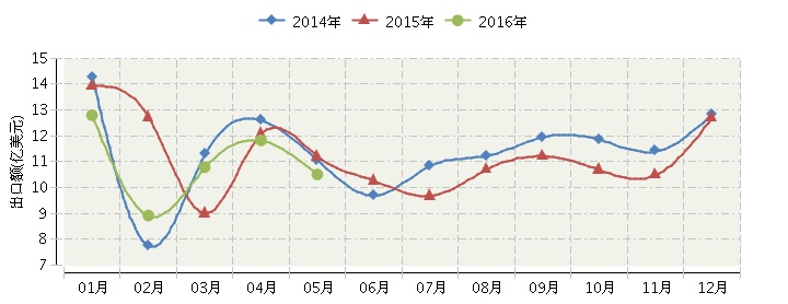 根据海关总署发布数据,2016年1月~5月,全国体育用品行业累计完成出口额54.82亿美元,同比增长-6.92%。其中:1月份完成出口额12.79亿美元,同比增长-8.12%;2月份完成出口额8.91亿美元,同比增长-29.96%;3月份完成出口额10.79亿美元,同比增长19.81%;4月份完成出口额11.82亿美元,同比增长-2.21%;5月份完成出口额10.5亿美元,同比增长-5.74%。2016年全国体育用品月度出口额及同比增长趋势如下图所示。
