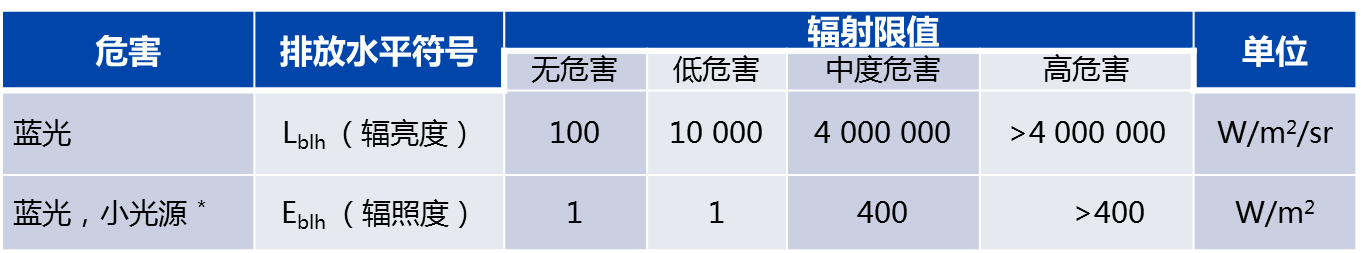 在国际电工委员会制定的IEC62471标准中规定了光辐射产品六方面危害的辐射限值。对于LED来说,最重要的是符合蓝光危害的辐亮度或辐照度限值。若LED光源或灯具符合低或无危害的辐射限值,即可认定该照明灯具没有光生物危害。