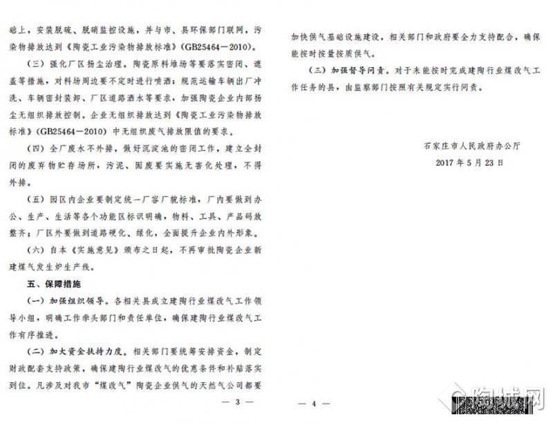 5月23日,石家庄市人民政府办公厅发布《关于石家庄市建陶行业统一推行煤改气的实施意见》,将对全市(高邑县、赞皇县、行唐县)现有34家陶瓷企业实施天然气改造。