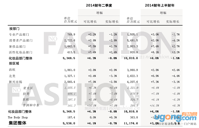 按部门,大众化妆品部门因美国大众市场复苏缓慢和新兴市场增长放缓,销售录得2.8%的下滑,可比基础下则录得2.8%的增长,低于分析师预期的3.2%,集团曾在四月预计该部门的北美销售本季度可重获增长。高档化妆品部门继续卓越表现,在中国、美国和西欧均显著扩大市场份额,二季度实际和可比增长率分别达2.7%和7.5%。专业产品部门同比减少1.2%,可比基础下增2.2%。活性健康化妆品部门实际和可比销售分别实现2.4%和7.4%的增长。The Body Shop 业绩基本与去年同期持平,总销售为1.9亿欧元。